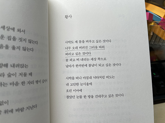 문을 열고 들어가면 아직 아픈 사람이 있어 내 청단풍잎 같은 손바닥으로 그의 이마를 짚어줄 수 있으면 좋으리. 문득 겨울을 맞은 나무처럼 삶의 지붕이 쓰라린 사람일 때엔 낮은 데서 빛나는 종소리 한 줌의 무게로 다가가 그의 가슴을 쓰다듬을 수 있으면 좋으리. 조금은 가난하고 조금은 깊어진 음성으로 먼 눈나라의 이야기를 들려줄 수 있으면 좋으리. 손금이 마주치는 순간의 평화와 안식을 얹어줄 수 있으면 좋으리. 그러나 아아, 그 아프고 쓰라린 사람이 영원히 나여서 단 하루라도 돌아가 그의 손 아래 내 이마와 어깨 눕힐 수 있으면 좋으리. 멀고 깊은 눈나라에 고요히 갇힐 수 있으면 좋으리.