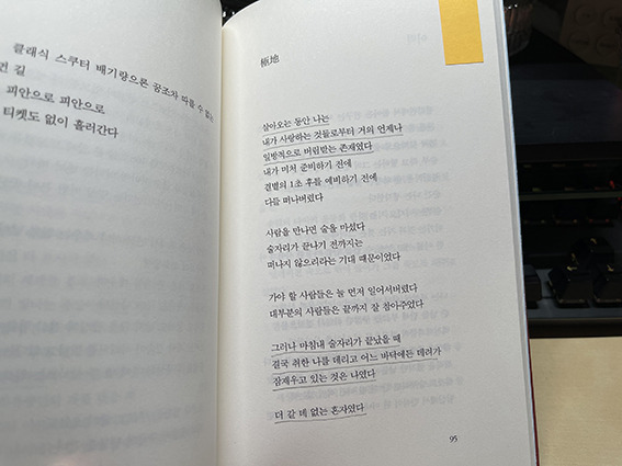 “집에 가는 길” 은 언제나 행복하지만 또 언제나 처절하다. 가족은 불편한 우군인 동시에 친밀한 적일 경우가 적잖다. 그러므로 지벵 바쳐지는 노래는 어쩌면 “위독한 사랑의 찬가” 일 수 밖에 없다. 이런 위험한 친밀성은 사회, 곧 인간관계의 솔직한 현실이기도 하다. 단지 ‘나’ 를 방호할 참호 안에 있는가 없는가의 차이에 따라 위험도가 달라질 뿐이다. 그러나 이 아이러닉한 현실에 걸려 있는 잘려진 ‘시간의 안팎’ 은 비극적이되 불행하지는 않다. 왜냐하면 이 불한 시간이야말로 “저 높은 곳으로 나를 데려가 낮은 곳의 별들을 보여주” 는 삶의 형식이기 때문이다. 아마도 포월 匍越 의 방식으로 불행한 시간을 부단히 월경하는 자에게만이 ‘나’ 와 ‘별’ 이 한 데 뒤섞이는 “지도에 없는 마을” = “깊은 곳” 은 허락될 것이다. ……