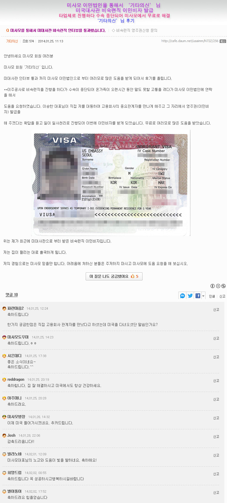 위 케이스는 기타의 신님이 '모 업체' 를 통해서 수수료로 전액 지불 하였으나 마지막 미대사관 인터뷰에 제출해야 하 는 '재고용확인서' 를 4달 이상 받지 못해서 전전긍긍하다 미사모 이민법인에 도움을 요청하였습니다. 고용회사에서 '모 업체' 로 통해 수속한 사람들에게는 재고용확인서를 발급하지 안는다는 사실을 확인하고 미사모 이민법인에서 '기타의신' 님을 대동하여 고용회사의 중요한 관계자를 만나게 해주고 재고용확인서를 빠른 시일내로 발급해주겠다는 약속을 받았습니다. 즉각 해결하여 미대사관을 통해 이민비자를 발급 받았습니다. 이밖에도 많은 케이스들을 해결 하였습니다.