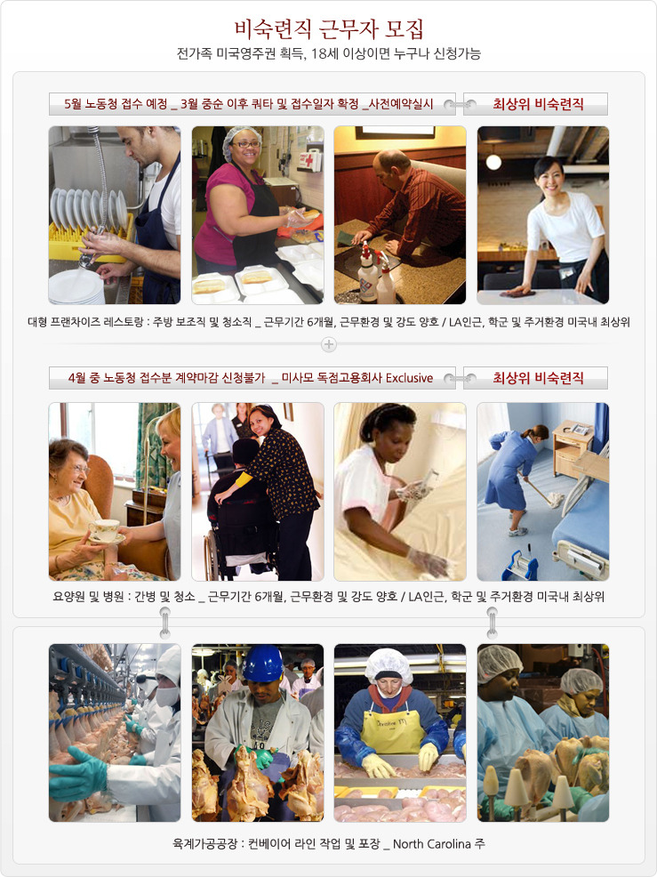 비숙련직 대기기간 대폭 단축 지금이 바로 계약 할 때 → 수속기간 1년4개월 미사모 직속 미국변호사가 고객의 케이스를 영주권 획득시 까지 세밀하게 관리 미국취업이민 3순위 비숙련직 요양원 및 병원 간병인(근무기간6개월,LA지역), 대형 프랜차이즈 레스토랑 주방보조 및 청소직(근무기간6개월,LA지역), 육계가공공장 근무직 모집 전가족 영주권획득 착한 계약 조건 E-2(소액투자비자) 유명 프랜차이즈 투자자 모집 18만불 부터, 4개월내 입국, 자녀 공립학교 무상교육 비자 거절시 전액 환불(단,1차변호사비용 2,250불 제외)