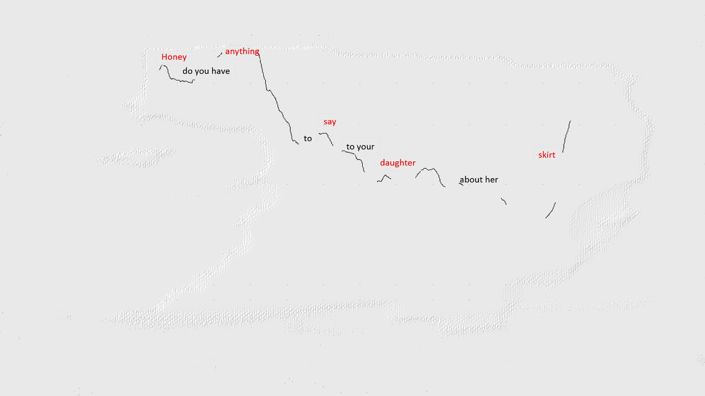 위에서 보시면 anything이 highest pictch이고 나머지 중요한 단어 honey, say, daughter, skirt 에도 stress를 주어 말했다는 것