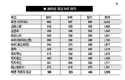 뉴저지 교육국이 14일 발표한 2006~2007학년도 각 학군별 성적표를 토대로 본보가 버겐 카운티의 한인 밀집지역 학군 고등학교의 시험성적을 분석한 결과, 평균 미 대학입학시험(SAT) 점수는 해캔색 소재 버겐 아카데미 고교가 2,025점으로 가장 높았다.
