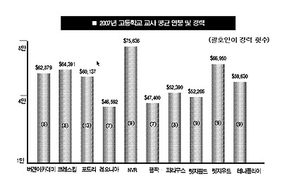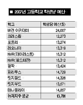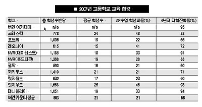 카운티 전체평균 SAT 점수 영어 500.수학 525 릿지우드.테나플라이등 재산세 높은지역 학군도 우수 버겐 카운티에서 학생들의 실력이 가장 우수한 고등학교는 해캔색 소재 버겐 아카데미인 것으로 나타났다. 뉴저지 교육국이 14일 발표한 2007년 뉴저지주 각 학군별 성적표에 따르면 버겐 아카데미는 버겐 카운티내 고등학교들 중 학생들의 평균 SAT 점수가 2,025점으로 가장 높았으며 학생당 지출된 예산도 2만4,007달러로 가장 높았다. <도표 참조> 총 1,072명의 학생들이 재학 중인 버겐 아카데미 고교의 4년제 대학진학 비율 또한 95%로 이 부문에서 테나플라이(94%)와 릿지우드(93%)만 근접했다. 한인 밀집 지역 학군 고등학교들의 SAT 평균점수를 분석해보면 버겐 아카데미와 더불어 릿지우드(1,771점)와 테나플라이(1,761점), 노던밸리 리저널 데마레스트(1,745)와 올드태판(1,677점), 그리고 크레스킬(1,658점) 등이 비교적 높았다. 버겐 카운티 전체 고등학생들의 평균 SAT 점수는 영어가 500, 수학이 525, 필기가 494점으로 합계 1,520점이었다.4년제 대학 진학률은 버겐 아카데미에 이어 테나플라이(94%)와 릿지우드(93%), 데마레스트(91%)와 크레스킬(88%), 올드태판(88%) 순위로 나타났다. 이번 성적표에 따르면 한인 밀집지역 중 팰팍과 릿지필드가 타 지역에 비해 SAT 점수와 대학진학율 등이 떨어졌으며 포트리와 레오니아는 평균인 것으로 나타났다.학군이 전반적으로 우수한 것으로 나타난 지역은 릿지우드, 테나플라이, 데마레스트, 올드태판, 크레스킬 지역 등으로 ‘교육환경이 좋은 곳의 세금이 높다’는 사실을 입증해줬다. 본보가 최근 뉴저지 재무부의 자료를 분석한 결과 버겐 카운티 한인 밀집 지역에서 2007년 재산세가 가장 높았던 타운은 테나플라이($15,467)와 데마레스트($13,882), 릿지우드($13,266) 순이었으며 올드태판($12,042)과 크레스킬($11,856)도 상위권에 올라 있었다. <2008년 1월28일 A1면> 이에 반해 팰팍은 7,908달러, 포트리는 7,135달러, 릿지필드는 6,828달러였던 것으로 조사됐다. 대학수준 코스인 AP(Advanced Placement) 수업에 참여하고 있는 학생들의 비율은 크레스킬과 레오니아, 릿지우드 등이 비교적 높은 것으로 나타났다. 학군이 학생 한명당 지출하는 예산과 관련해서는 버겐 아카데미를 제외한 나머지 학군들이 거의 비슷한 수준이었다. 한편 교사들의 평균 연봉은 노던 밸리 리저널(데마레스트와 올드태판) 고등학교가 7만5,636달러로 버겐 카운티 한인 밀집 학군 중 가장 높았으며 릿지우드(6만6,950달러)와 크레스킬(6만4,391달러)가 그 뒤를 이었다. 뉴저지 공립 고등학교 교사들의 평균 연봉은 5만5,550달러였다. <정지원 기자> |