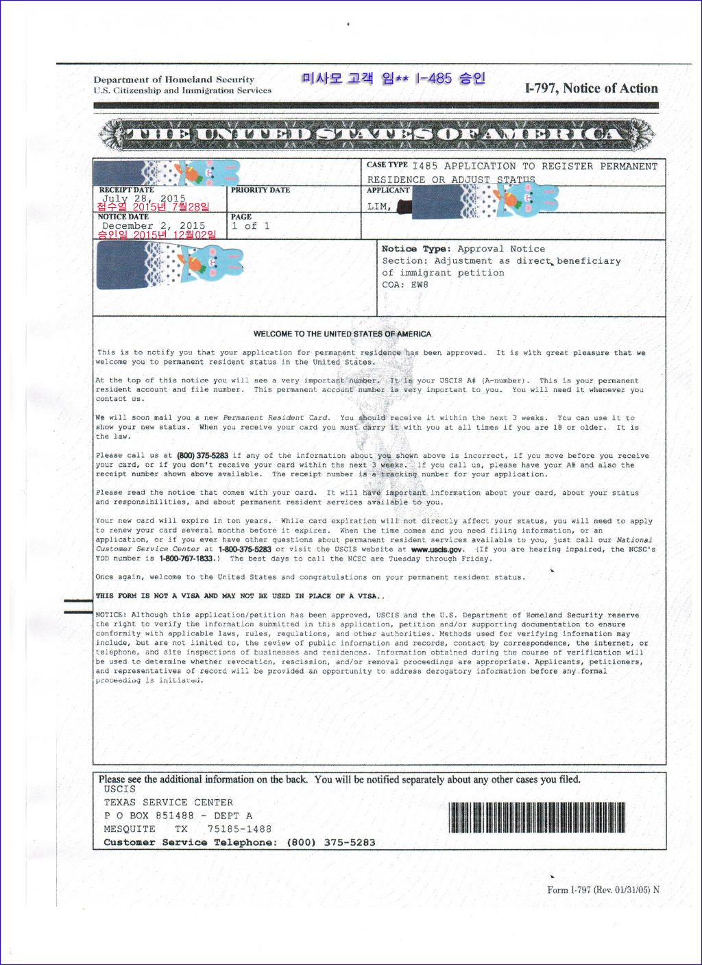 미사모 비숙련직 고객 임**님은 미사모의 도움으로 영주권을 취득하신 분의 소개로 계약을 하셨고 2014년 6월 14일 육계가공직으로 노동청에 접수후 1년 6개월만에 영주권을 취득하였습니다. 2015년 5월12일 이민국에 I-140(이민청원)을 접수하셨고 2015년 06월24일 승인되었습니다. 당시 학생비자로 미국에 체류 중이셨기 때문에 I-140 승인 후 2015년7월 I-485(신분변경) 접수를 하셨습니다.