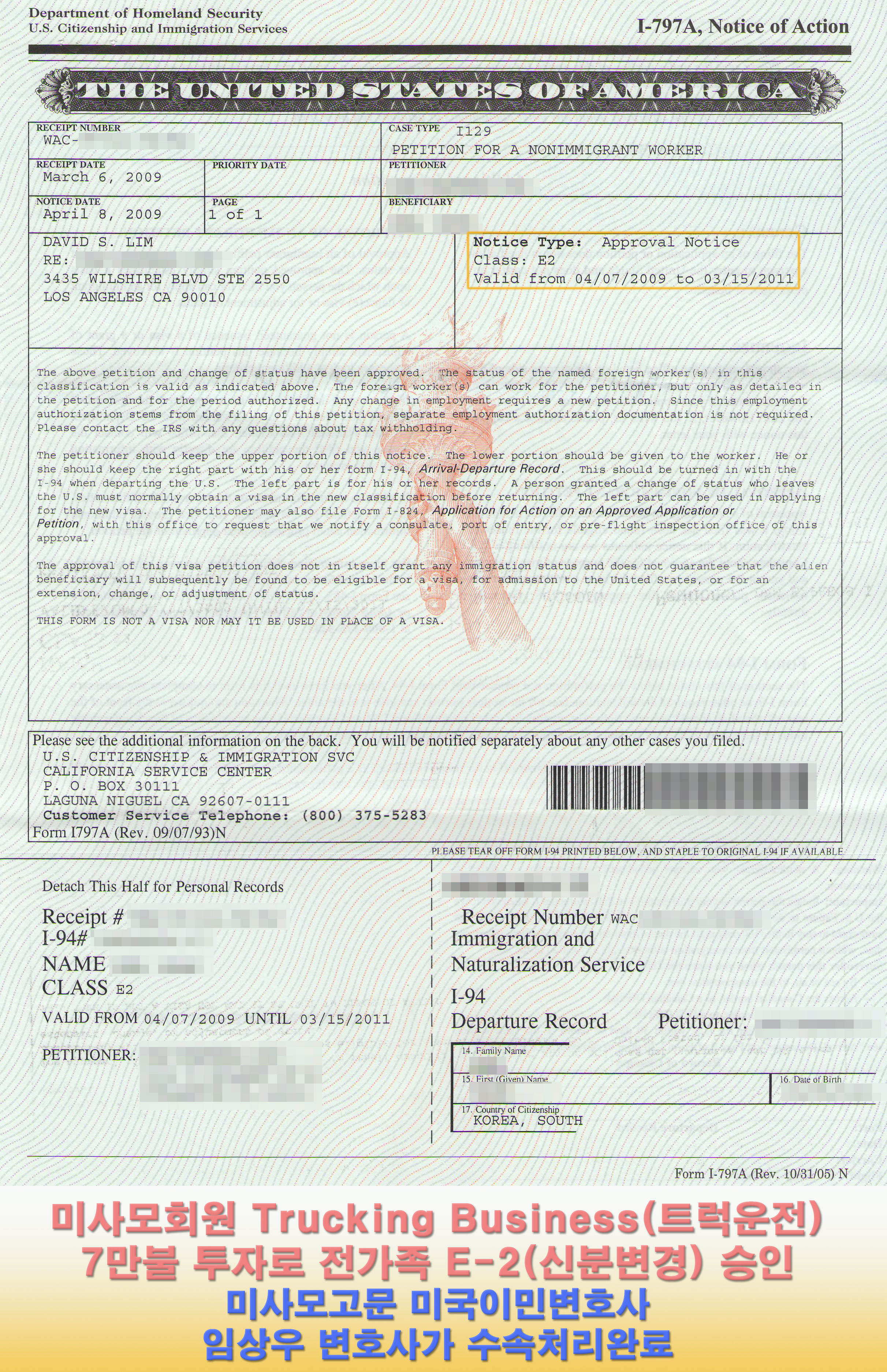 E-2에서 비교적 적은 금액인 총6~7만불(중고트럭구매+사무실등)을 투자하여 E-2 신분변경을 승인(주한미대사관 신청시는