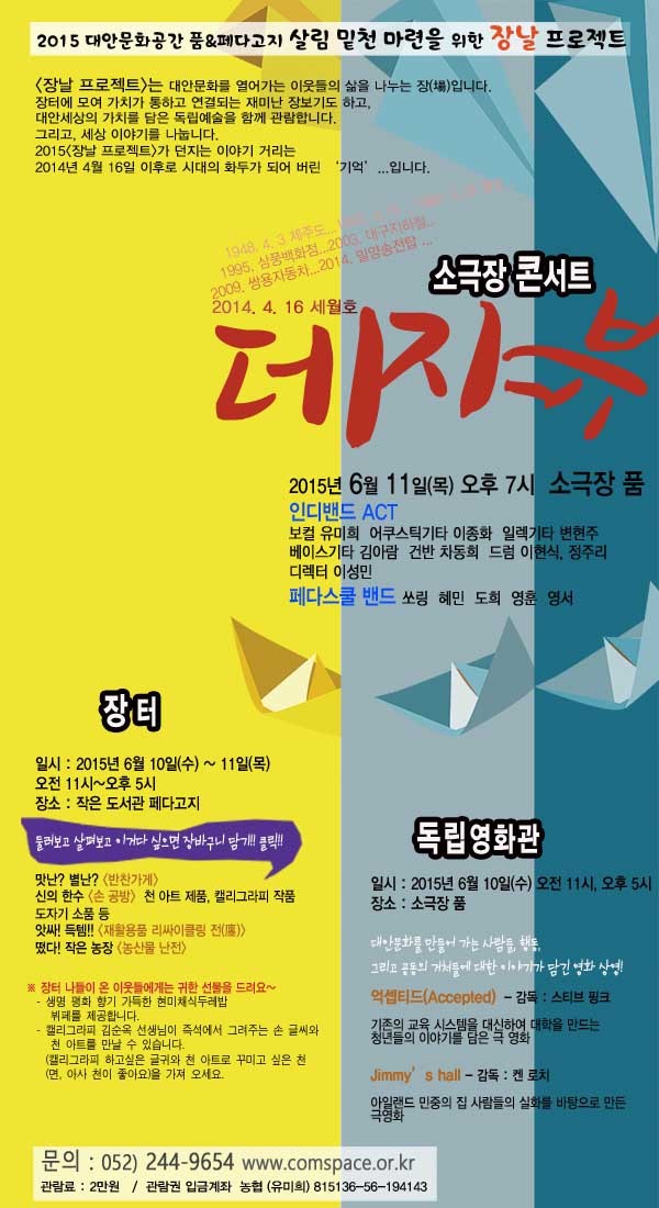 2015 장날 프로젝트는 장터, 독립영화관, 소극장 콘서트로 구성합니다.