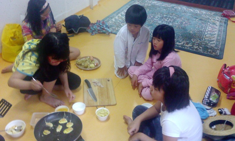물놀이를 한참 한 후에 숙소로 돌아와서 일단 씻기. 옷도 씻고 밖에 말리고 스스로 아이들이 잘 하였다. 내가 그냥 옷을 척 하니 말리고 있으니 물을 짜야한다며 자기들끼리 옷을 돌리며 짠다. 그리고 난 후 저녁밥하기. 가지고 온 재료를 다 보여준 후 저녁을 하라고 하였다.