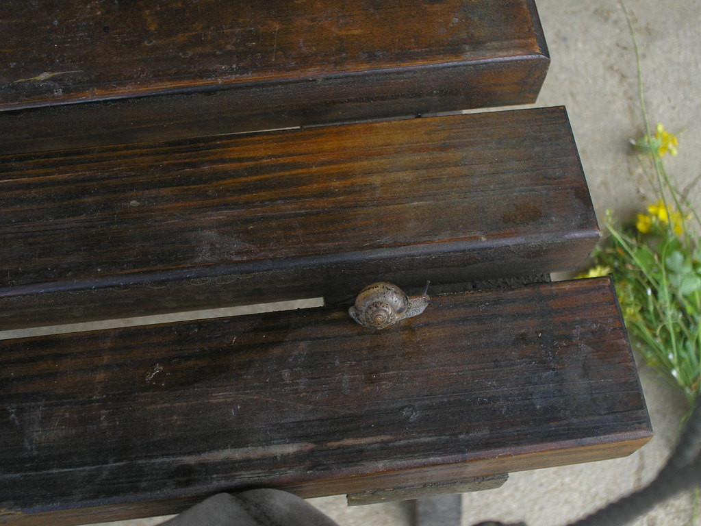 달팽이의 기어가는 모습을 찬찬히 살펴보고 있다.