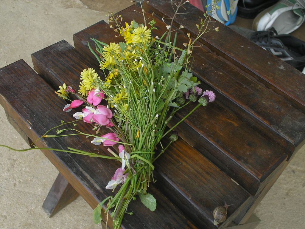 자연놀이터라고 하던가 뽑았던 풀과 야생화들을 모아서 꽃다발도 만들고 달팽이도 발견...움직이는지 관찰한다.