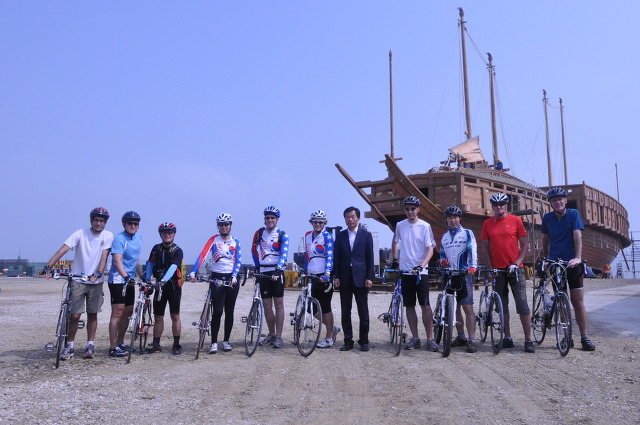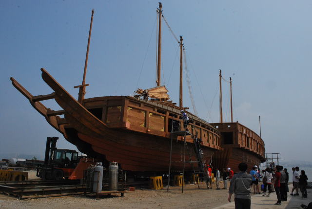Riding continues apace as we journey south. The highlight of our latest day’s ride, beginning in Boryeong and ending in Gunsan was our stop on the north side of the Geum River in Seocheon to see and tour construction of a full-sized replica of Admiral Yi Sun-shin’s turtle boat, or geobukseon. Mr. Ahn Gwang-il, the director involved in the replica project, explained to us that this is not the first time Koreans have rebuilt a turtle ship. More than previous replication efforts, however, this project is based on extensive recent research on the dimensions and construction methods consistent of both ironclad vessels and other military ships at the time.