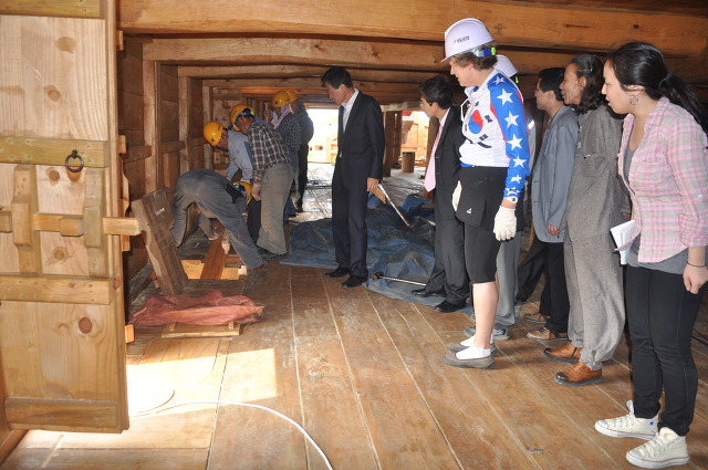 As the head craftsman/crew foreman explained their construction method, I found, at least to a non-expert like myself, similarities between the building styles of geobukseon and building a traditional hanok, especially the use of wooden beams and the amazing fact that no nails are used in the ship’s construction. The feverish pitch of activity from the skilled craftsmen might be due to the fact that the ship is set to launch in two days, a few days’ after which it will head for Gyeongsangnamdo and ports unknown.
