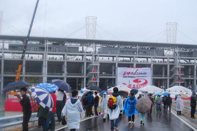Entering the F1 race track. Fans filled the stands, despite the rain.