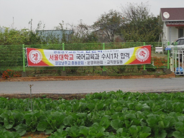 I like this picture, taken while biking in the rural reaches of Yeongam. It says, “Congratulations on Early Admittance to Seoul National University, Department of Korean Language Education“, and shows the pride of the community in the achievement of a local student.