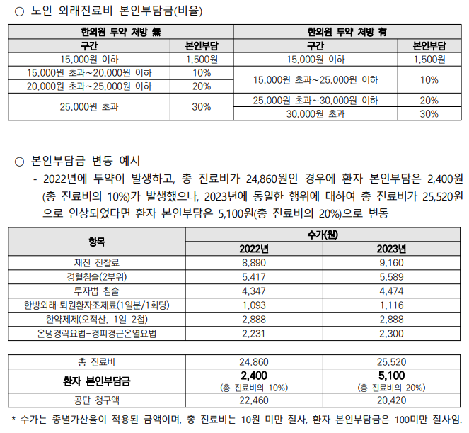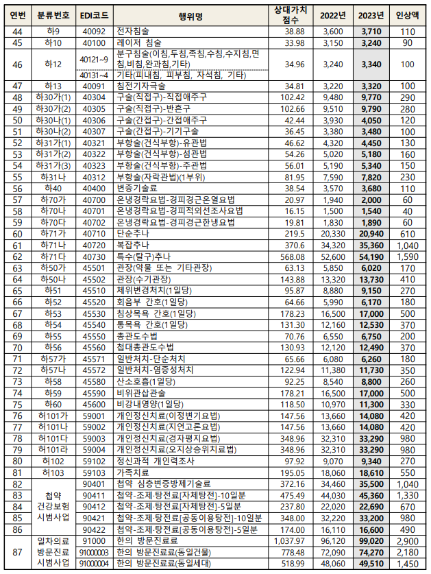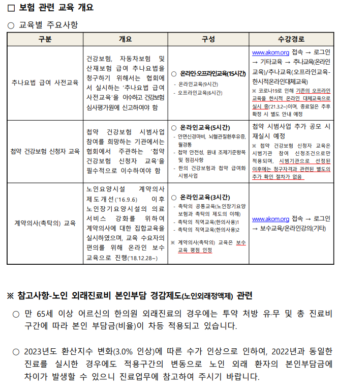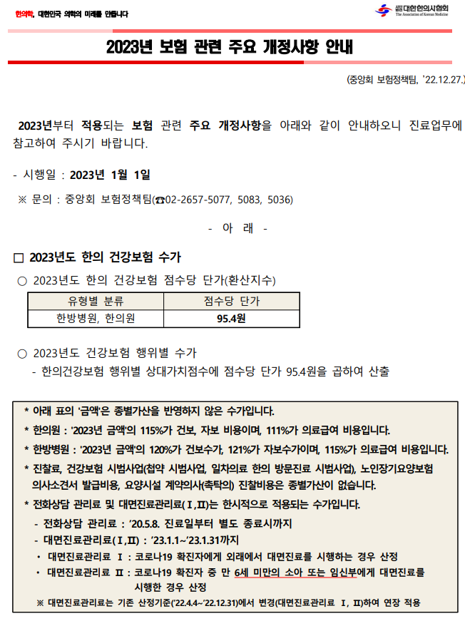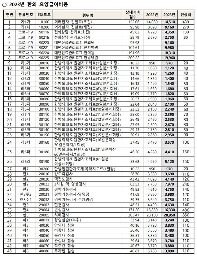2023년 보험 관련 주요 개정사항 안내 작성자사무처장/강동원|작성시간22.12.27|조회수34 목록 댓글 0 글자크기 작게가 글자크기 크게가 첨부1-1. 2023년 한의 요양급여비용(한의원 종별 가산 반영)-akom게시용.xlsx26.02KB첨부1-2. 2023년 한의 요양급여비용(한의원 종별 가산 반영)-akom게시용.pdf130.40KB첨부3. 2023년 첩약 건강보험 시범사업 수가표.xlsx14.30KB첨부4. 추나요법 급여 사전교육 이수증 발급 방법 및 심평원 이수 신고 방법 (1).pdf323.16KB첨부5. 노인장기요양보험 의사소견서 발급 및 청구 매뉴얼.pdf12.48MB첨부6. 노인장기요양보험 방문간호지시서 발급 및 청구 매뉴얼.pdf9.69MB 첨부파일첨부된 파일이 13개 있습니다. xlsx 파일 첨부1-1. 2023년 한의 요양급여비용(한의원 종별 가산 반영)-akom게시용.xlsx 다운로드 pdf 파일 첨부1-2. 2023년 한의 요양급여비용(한의원 종별 가산 반영)-akom게시용.pdf 다운로드 xlsx 파일 첨부3. 2023년 첩약 건강보험 시범사업 수가표.xlsx 다운로드 pdf 파일 첨부4. 추나요법 급여 사전교육 이수증 발급 방법 및 심평원 이수 신고 방법 (1).pdf 다운로드 pdf 파일 첨부5. 노인장기요양보험 의사소견서 발급 및 청구 매뉴얼.pdf 다운로드 pdf 파일 첨부6. 노인장기요양보험 방문간호지시서 발급 및 청구 매뉴얼.pdf 다운로드 png 파일 image.png 다운로드 png 파일 image.png 다운로드 png 파일 image.png 다운로드 png 파일 image.png 다운로드 png 파일 image.png 다운로드 png 파일 image.png 다운로드 png 파일 image.png 다운로드 다음검색 현재 게시글 추가 기능 열기 북마크 공유하기 신고 센터로 신고 댓글 댓글 0 댓글쓰기 답글쓰기 댓글 리스트