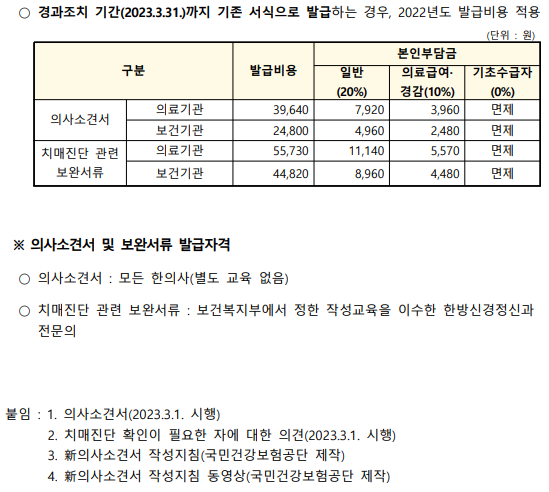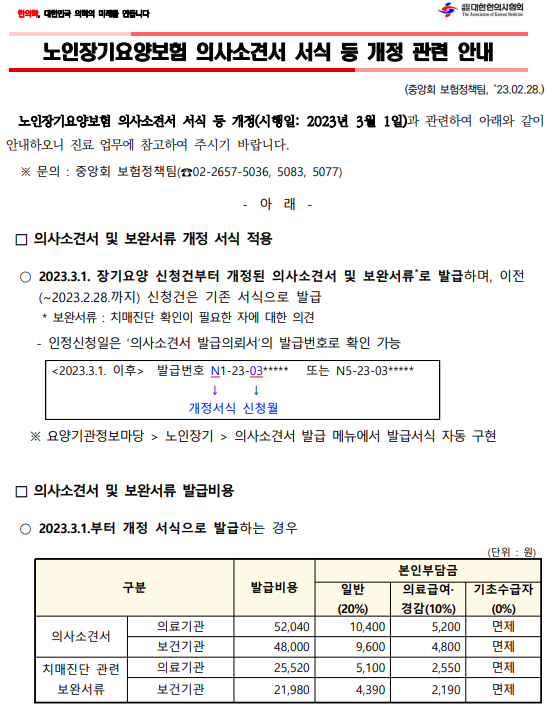 노인장기요양보험 의사소견서 서식 등 개정 관련 안내 작성자사무처장/강동원|작성시간23.02.28|조회수123 목록 댓글 0 글자크기 작게가 글자크기 크게가 붙임1. 노인장기요양보험법_시행규칙_[별지_제2호서식]_의사소견서(2023.3.1._시행).hwp65.50KB붙임2. 노인장기요양보험법_시행규칙_별지_제2호서식_관련_보완서류_치매진단_확인이_필요한_자에_대한_의견(23.3.1._시행).hwp49.52KB붙임3. 新의사소견서 작성지침.pdf13.27MB 첨부파일첨부된 파일이 5개 있습니다. png 파일 image.png 다운로드 png 파일 image.png 다운로드 hwp 파일 붙임1. 노인장기요양보험법_시행규칙_[별지_제2호서식]_의사소견서(2023.3.1._시행).hwp 다운로드 hwp 파일 붙임2. 노인장기요양보험법_시행규칙_별지_제2호서식_관련_보완서류_치매진단_확인이_필요한_자에_대한_의견(23.3.1._시행).hwp 다운로드 pdf 파일 붙임3. 新의사소견서 작성지침.pdf 다운로드 다음검색 현재 게시글 추가 기능 열기 북마크 공유하기 신고 센터로 신고 댓글 댓글 0 댓글쓰기 답글쓰기 댓글 리스트