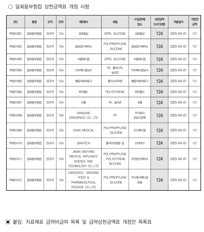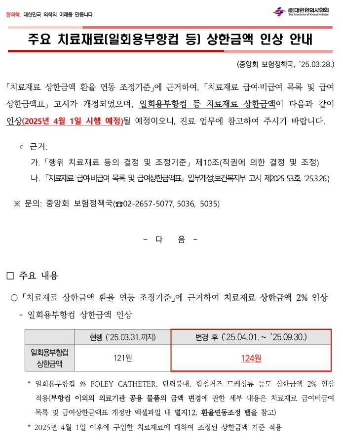 치료재료(일회용부항컵 등) 상한금액 인상 안내 작성자사무처장/강동원|작성시간25.03.31|조회수35 목록 댓글 0 글자크기 작게가 글자크기 크게가 250328-(안내문) 주요 치료재료(일회용부항컵 등) 상한금액 인상 안내.pdf4.36MB붙임-(2025-53호)치료재료+급여+비급여+목록+및+급여상한금액표+개정(목록표).xlsx1.79MB 첨부파일첨부된 파일이 4개 있습니다. png 파일 image.png 다운로드 png 파일 image.png 다운로드 pdf 파일 250328-(안내문) 주요 치료재료(일회용부항컵 등) 상한금액 인상 안내.pdf 다운로드 xlsx 파일 붙임-(2025-53호)치료재료+급여+비급여+목록+및+급여상한금액표+개정(목록표).xlsx 다운로드 다음검색 현재 게시글 추가 기능 열기 북마크 공유하기 신고 센터로 신고 댓글 댓글 0 댓글쓰기 답글쓰기 댓글 리스트