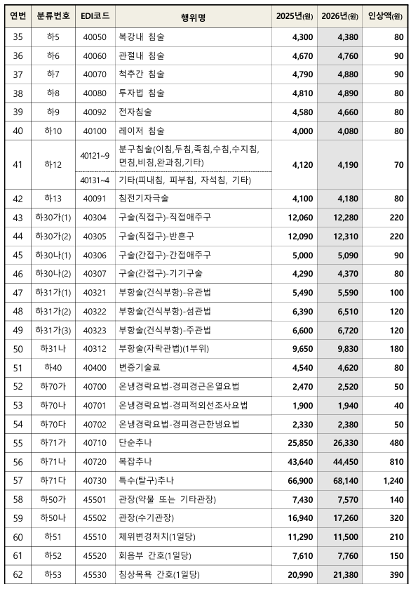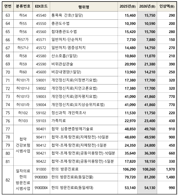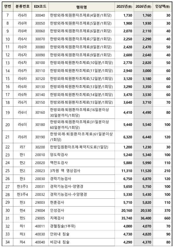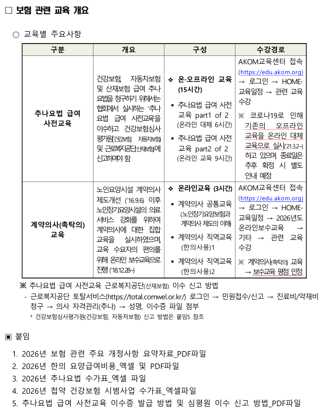 2026년 보험 관련 주요 개정사항 안내 작성자사무처장/강동원|작성시간25.12.31|조회수3 목록 댓글 0 글자크기 작게가 글자크기 크게가 안내문-2026년 보험 관련 주요 개정사항 안내.pdf346.12KB붙임1. 2026년 보험 관련 주요 개정사항 요약자료.pdf216.49KB붙임2. 2026년 한의 요양급여비용.xlsx24.11KB붙임3. 2026년 추나요법 수가표.xlsx16.99KB붙임4. 2026년 첩약 건강보험 적용 시범사업 수가표.xlsx24.59KB붙임5. 추나요법 급여 사전교육 이수증 발급 방법 및 심평원 이수 신고 방법.pdf1.32MB 첨부파일첨부된 파일이 12개 있습니다. png 파일 image.png 다운로드 png 파일 image.png 다운로드 png 파일 image.png 다운로드 png 파일 image.png 다운로드 png 파일 image.png 다운로드 png 파일 image.png 다운로드 pdf 파일 안내문-2026년 보험 관련 주요 개정사항 안내.pdf 다운로드 pdf 파일 붙임1. 2026년 보험 관련 주요 개정사항 요약자료.pdf 다운로드 xlsx 파일 붙임2. 2026년 한의 요양급여비용.xlsx 다운로드 xlsx 파일 붙임3. 2026년 추나요법 수가표.xlsx 다운로드 xlsx 파일 붙임4. 2026년 첩약 건강보험 적용 시범사업 수가표.xlsx 다운로드 pdf 파일 붙임5. 추나요법 급여 사전교육 이수증 발급 방법 및 심평원 이수 신고 방법.pdf 다운로드 다음검색 현재 게시글 추가 기능 열기 북마크 공유하기 신고 센터로 신고 댓글 댓글 0 댓글쓰기 답글쓰기 댓글 리스트