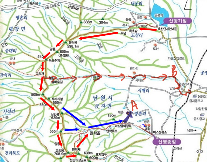 ▶산행코스: A코스: 내동리~ 문덕봉~고정봉~그럭재~두바리봉~삿갓봉~고리봉~만학재~만학동계곡~매월당~매촌경로당
