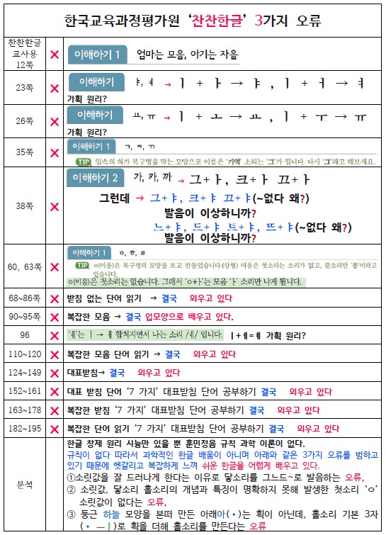 ☞ 이론 오류가 3가지(닿소리 발음 오류, 첫소리 이응 소릿값 오류, 홀소리 만든 오류)나 됩니다.