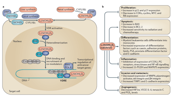 비타민 D의 작용에 대한 실험실 연구 (in vitro study)에서는 암세포의 성장을 억제하며, 세포자살 (apoptosis)를 증가시키고, 분화를 유도하며, 염증반응을 가라앉히고, 암의 주위조직 침범과 전이에 관여하는 요소를 줄여주고, 신생혈관형성을 억제시키는 것이 관찰되었습니다.