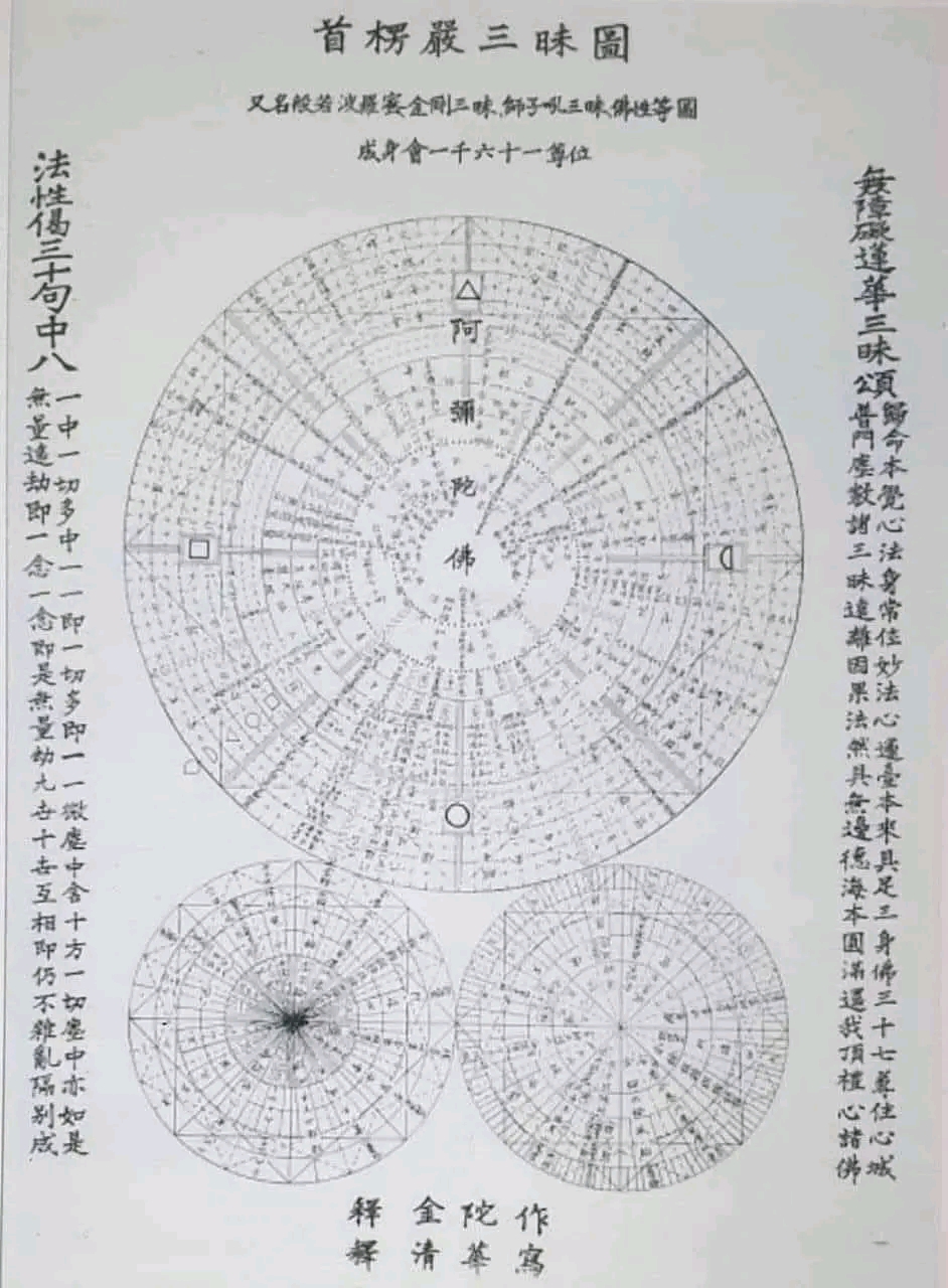 마음은 허공과 같을새 한 조각 구름이나 한 점 그림자도 없이 크고 넓고 끝없는 허공 같은 마음세계를 관찰하면서 청정법신인 비로자나불을 생각하고, 이러한 허공 같은 마음세계에 해와 달을 초월하는 금색광명을 띤 한없이 맑은 물이 충만한 바다와 같은 성품바다를 관찰하면서 원만보신인 노사나불을 생각하며, 안으로 생각이 일어나고 없어지는 형체 없는 중생과 밖으로 해와 달과 별과 산과 내와 대지 등 삼라만상의 뜻이 없는 중생과 또는 사람과 축생과 꿈틀거리는 뜻이 있는 중생 등의 모든 중생들을 금빛 성품바다에 바람 없이 금빛 파도가 스스로 뛰노는 거품으로 관찰하면서 천백억화신인 석가모니불을 생각하고, 다시 저 한량없고 끝없이 맑은 마음세계와 청정하고 충만한 물거품 같은 중생들을 공空과 성품性과 현상相이 본래 다르지 않는 한결같다고 관찰하면서 법신, 보식, 화신의 삼신이 원래 한 부처인 아미타불을 항시 생각하면서, 안팎으로 일어나고 없어지는 모든 현상과 헤아릴 수 없는 중생의 덧없는 행동들을 마음이 만 가지로 굴러가는 아미타불의 위대한 행동 모습으로 생각하고 관찰할지니라,