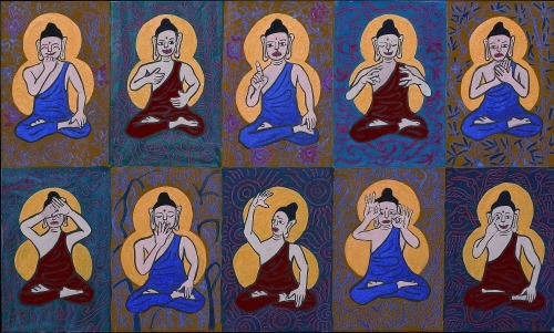그 곳에서 환한 색채로 피어난 부처님 만다라를 만났습니다. 이 전시는 바로 이호신작가의 <진리의 숲, 천불 만다라> 전이었습니다. 나중에 작가분의 부인을 만나 잠깐 이야기를 나누었는데, 이번 전시는 작가가 6년 동안 수행처럼 그린 천 분의 부처님을 세상에 내보이는 것이라 하였습니다. 이호신 작가의 부처님은 수화로 법화경을 설하고 계셨답니다.