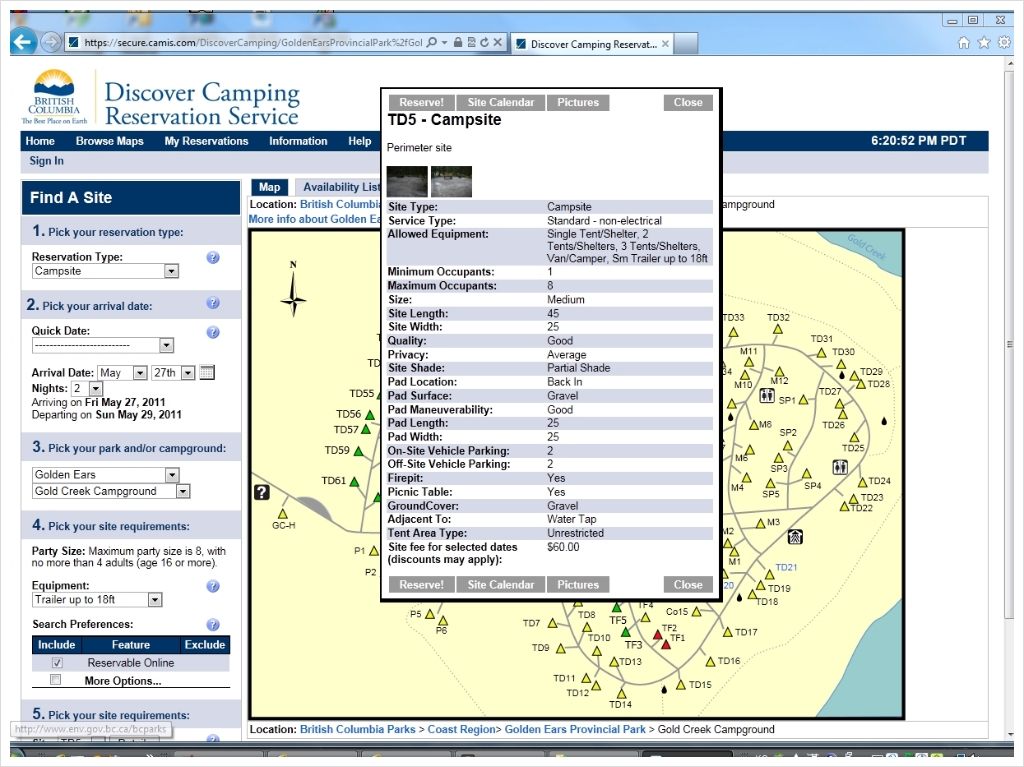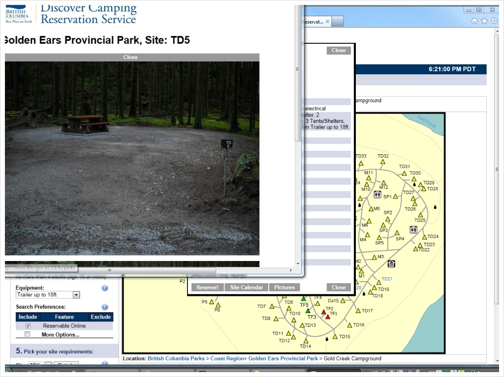 제가 좋아하는 TD5 싸이트를 클릭해 보았습니다. 싸이트에대한 자세한 내용이 나타납니다. 상세내용 상단의 사진을 클릭하면 싸이트의 사진도 보입니다. 마음에 드시면 Reserve를 클릭하시면 예약 창으로 넘어갑니다.