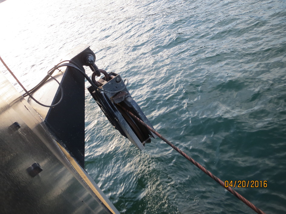 이 배는 튼튼한 강철 줄로 끌어 당겨 왔다 갔다 한다.