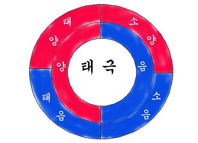 태극(太極)으로부터 양의(兩儀)로 분화된 양(陽)은 다시 음양(陰陽)의 배수(倍數)를 얻었으니 그 명칭은 태양(太陽)은 양(陽)의 본성을 그대로 답습하여 두 획을 얻으나 소음(少陰)은 두 획 가운데 상(上)에는 음(陰)의 획(畫)을 그은 것은 주(主)가 되는 것이요, 그 밑에 연접하여 양(陽)의 한 획은 음(陰)을 따르니 하(下)에 있는 것이다. 비록 소음(少陰)이라 하더라도 그 뿌리는 양(陽)에서 기원했으니 양(陽)의 획(畫)을 거느린 상(象)이다.
