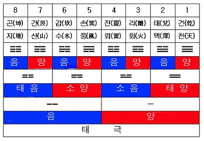 사상(四象)에서는 2획으로 구분했으나 8수에서는 각기 3획을 그어서 8괘(八卦)를 형성하였다.