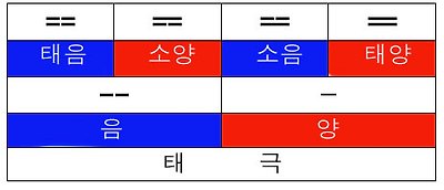 태극(太極)으로부터 양의(兩儀)로 분화된 음(陰)은 다시 음양(陰陽)의 배수(倍數)를 얻은 소양(少陽)을 먼저 배치한 것은 항상 홀수가 우선하기 때문이다. 그래서 소양(少陽)의 두 획에서 상의 획은 양(陽)이요, 그 밑에 음(陰)의 획을 거느린다. 태음(太陰)은 두 획이 모두 음(陰)의 획을 지니니 사상(四象) 가운데 가장 음(陰)이 큰 것이다. 여기서 음(陰)이 아무리 크다고 한들 소양(少陽)에 미치지 못하는 것은 천수(天數)가 우선하기 때문이다.