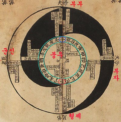 ▲상기의 자료는 거꾸로 본 그림으로 중앙의 원안에 자오(子午)를 식별할 수 있기에 제시한 것으로 백색은 더위, 흑색은 겨울이다. 그리고 유교의 오륜(五倫)으로 동쪽에 군신유의(君臣有義), 북쪽에 부자유친(父子有親), 서쪽에 부부유별(夫婦有別), 남쪽에 장유유서(長幼有序), 중앙에 붕우유신(朋友有信)을 자의로 삽입하여 유교의 덕목을 강조하였다.
