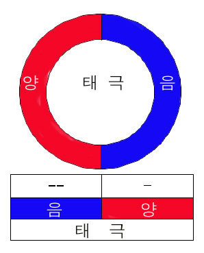 △태극(太極)이 나누어져서 하나의 기수(奇數, 홀수)와 하나의 우수(偶數, 짝수)가 생겨서 한 획(畫)을 한 것이 둘이니 이것이 양의(兩儀)이다.