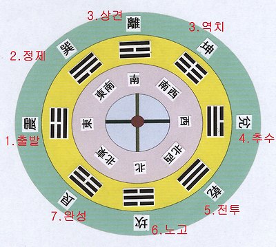 제왕은 동쪽의 진괘(震卦)에서 출발하여 동남방의 손괘(巽卦)에 이르러 심신을 정제하고, 남방의 리괘(離卦)에 이르러 만물을 바라보며 천하(天下)를 밝게 치정하고, 남서방의 곤괘(坤卦)에 이르러 땅에서 기르는 모든 것을 다스리고, 서방에 태괘(兌卦)에 이르러 가을에 모든 것을 거두니 기쁨이요, 북서방에 건괘(乾卦) 이르러 싸움을 하니 음양(陰陽)이 싫어하고, 정북방의 감괘(坎卦)에 이르니 만물이 저장에 노고하고, 동북방의 간괘(艮卦)에 이르러 만물이 완성되어 종결하는 동시에 다시 시작하는 곳이다.