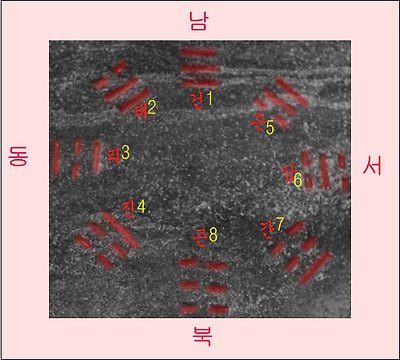 ▲8괘도(八卦圖)는 방위도(方位圖)라고 칭하는데, 복희팔괘도(伏羲八卦圖)는 자연의 음양(陰陽)을 순환하는 것으로 방위를 애써 부여하면 혼동을 초래할 뿐이다. 즉, 문왕팔괘도(文王八卦圖)에 건(乾)은 서북방이요, 곤(坤)은 서남방에 자리하고 있어 방위와 무관한 것을 알 수 있다.