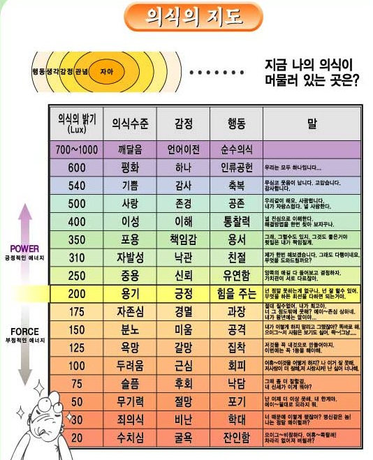 이 연구를 하는 동안 수백만건의 측정을 통해 전자기장이 쇳가루를 모으듯 특정한 끌개 에너지 장들에 의해 자리잡힌, 널리 인정되는 일련의 태도 및 감정과 정확히 일치하는 가치들의 범주를 정의할 수 있었다. 우리는 그 에너지 장들이 임상적으로 정확한 것은 물론 쉽게 이해될 수 있도록 그에 관해 다음의 분류를 채택했다. 측정치가 산술급수가 아닌 로그급수를 나타낸다는 것은 기억해야할 매우 중요한 사항이다. 그래서 300수준은 150이라는 크기의 두배가 아니다. 그것은 10을 300번 거듭제곱한 것이다(10 300승). 따라서 몇점의 증가도 힘의 큰 발전을 나타낸다. 우리가 의식척도를 따라 상승 이동하는 동안 힘의 증가율은 엄청나다.