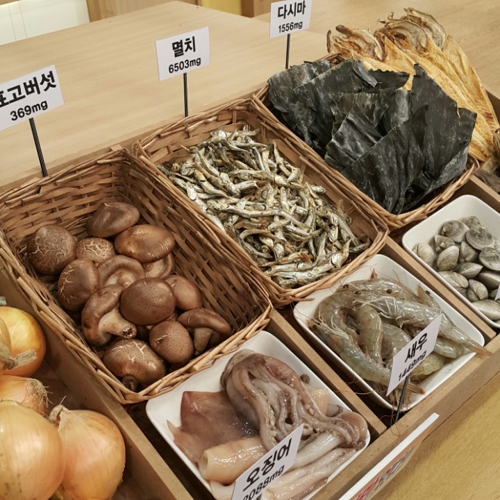 다시마, 멸치, 새우, 소고기, 닭고기, 표고, 황태, 양파, 토마토, 우유등에서 감칠맛을 끌어 낼 수 있습니다