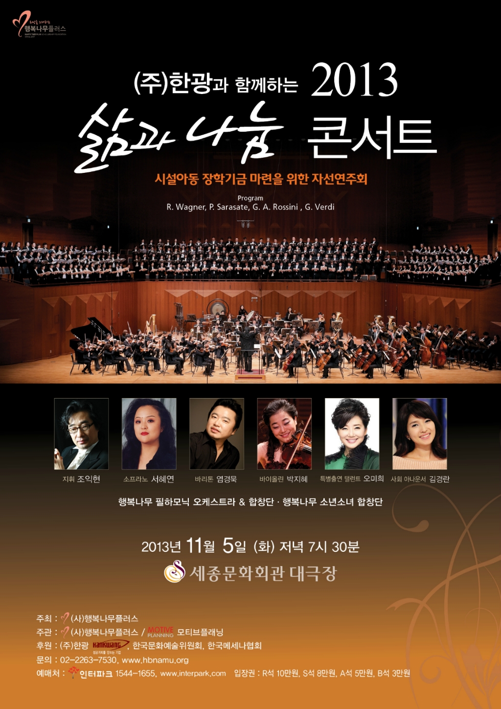 □ 그동안 비영리사단법인 행복나무플러스에서는 이러한 음악회를 ‘삶과 나눔 콘서트’라는 이름으로 시리즈로 이어왔다. ‘삶과 나눔 콘서트’ 시리즈는 행복나무플러스가 매년 주최하는 음악회로서, 조익현 예술총감독의 지휘 아래 국내외 최정상의 협연자들과 100여명의 행복나무필하모닉오케스트라, 400여명의 행복나무합창단이 함께 만들어가는 음악회이다. 음악회의 수익금은 전액 시설아동 장학금으로 사용되며, 현재 19명의 고아원출신 대학생이 장학혜택을 받으며 꿈을 키워나가고 있다. 또한 ‘삶과 나눔 콘서트’ 시리즈를 통해 벌써 6명이 졸업을 하여 사회인으로 성장했다.