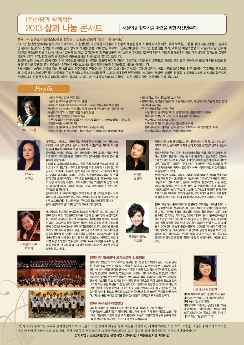 오는 11월 5일(화) 저녁7시 30분, 세종문화회관 대극장에서 시설아동 장학기금마련을 위한 “삶과 나눔 콘서트”가 꾸며진다. |