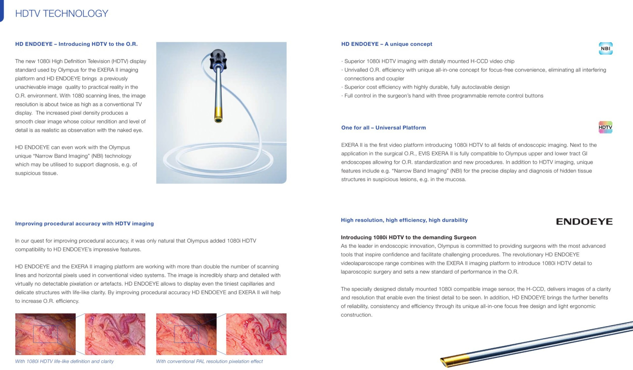 NBI는 광학 이미지 향상 기술로 점막 표면의 혈관 및 기타 조직의 이미지를 더욱 뚜렷하게 제공합니다. 올림푸스 제품에서만 사용할 수 있는 기능으로 기존 모델보다 20% 더 밝은 NBI 기능을 사용할 수 있습니다.