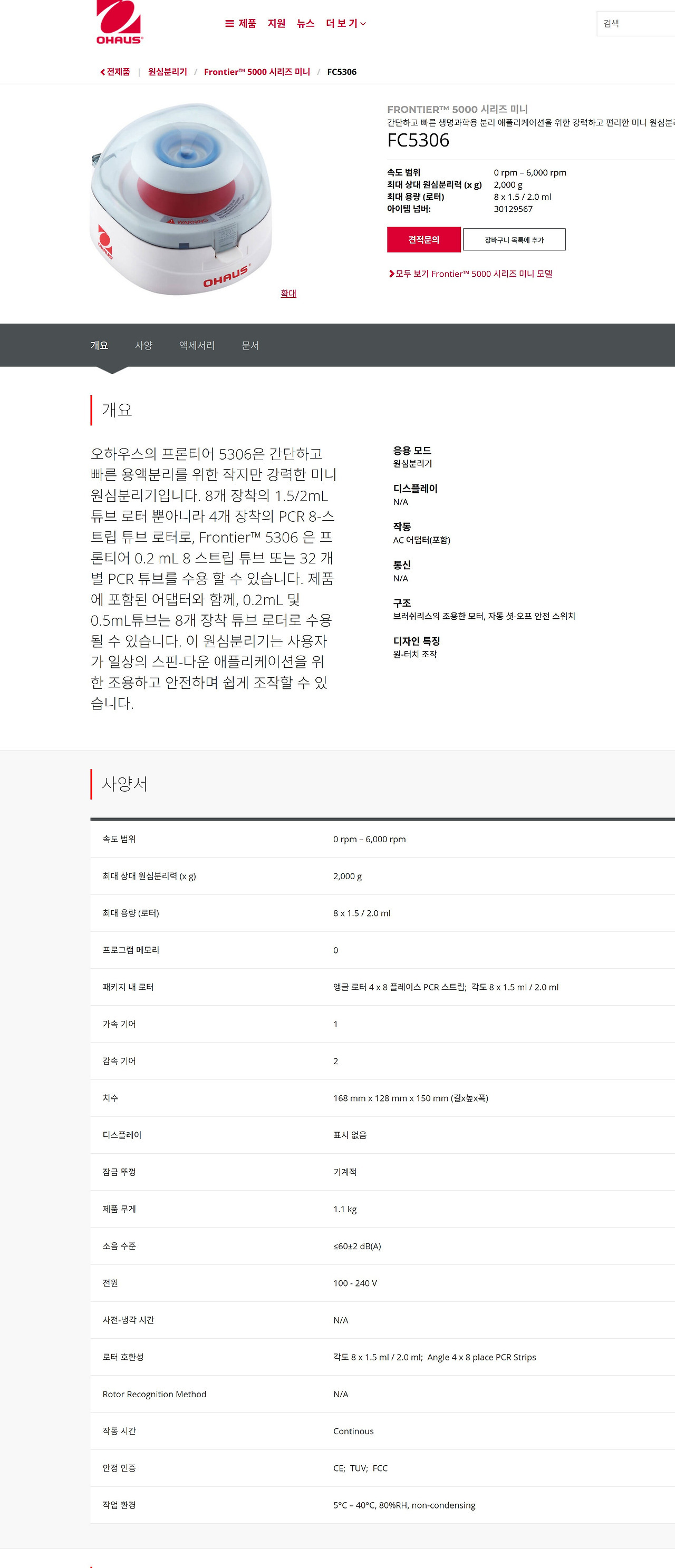 오하우스의 프론티어 5306은 간단하고 빠른 용액분리를 위한 작지만 강력한 미니 원심분리기입니다. 8개 장착의 1.5/2mL 튜브 로터 뿐아니라 4개 장착의 PCR 8-스트립 튜브 로터로, Frontier™ 5306 은 프론티어 0.2 mL 8 스트립 튜브 또는 32 개별 PCR 튜브를 수용 할 수 있습니다. 제품에 포함된 어댑터와 함께, 0.2mL 및 0.5mL튜브는 8개 장착 튜브 로터로 수용될 수 있습니다. 이 원심분리기는 사용자가 일상의 스핀-다운 애플리케이션을 위한 조용하고 안전하며 쉽게 조작할 수 있습니다.