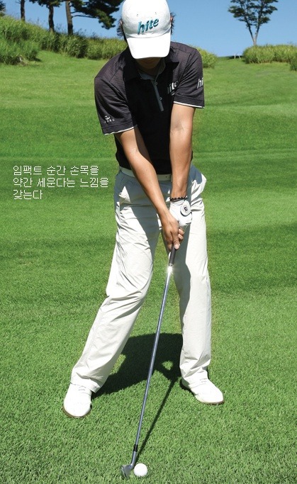 첫째, 임팩트 시에 클럽 헤드는 볼의 비구방향으로 밀어내야 한다.