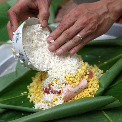 3. 반쯩을 쌀때는 찹쌀 돼지고기 녹두 등을 넣고 라쭈이(바나나잎-남부, 중부) 이나