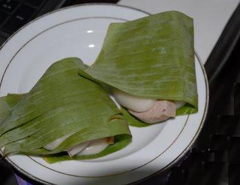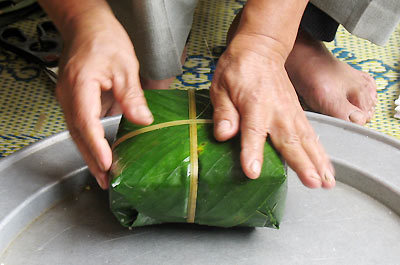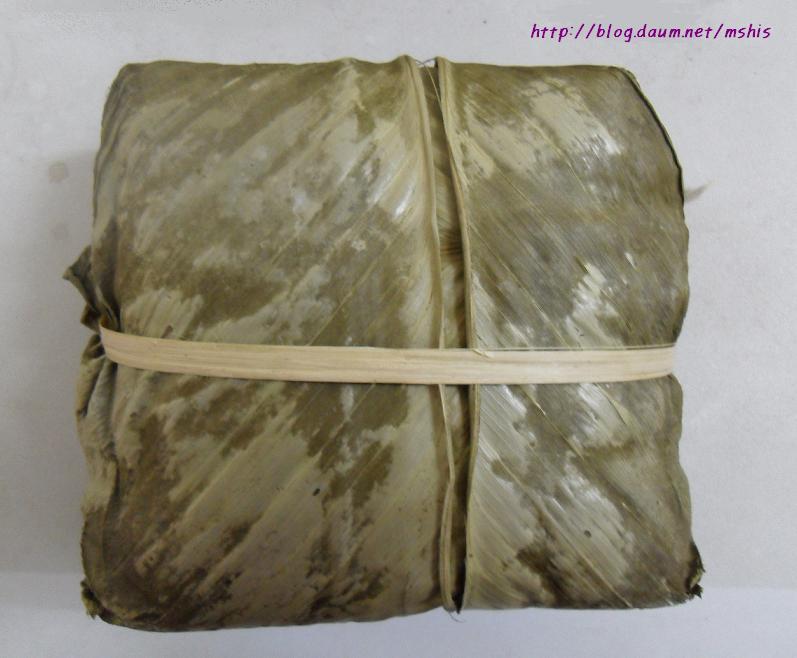 라용(생강잎-북부)을 사용하여 정사각형 모양으로 싸서 만든다.