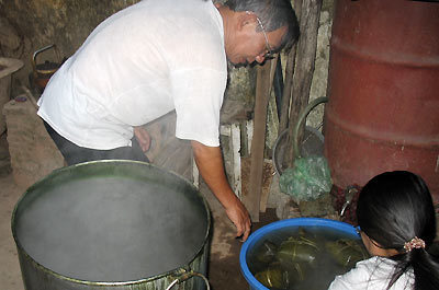 4. 모양이 완성되면 장작, 왕겨, 또는 톱밥을 재료로 불에 찌는데, 그 맛이 일품이다.