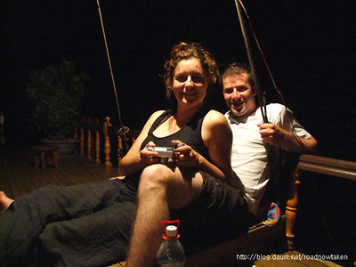 밥을 한 식탁에서 먹는 다는 이유로 친해 진 프랑스 커플. 그리고 라오스 출신 프랑스애. 겉 보기에는 30대로 보이던 남자애는 26살이라며, 멋접게 웃는다. 자기 나이 먹어 보인다며... 사실 그랬다. 나랑 비슷한 연배인줄 알고 친해지려 했는데 10살이나 밑이라니...쩝. 어쨋든 아직 결혼은 안했는데 임신 2개월이라고 한다. ^^ 또 다른 애는(동영상에 나오는 빡빡이) 라오스에서 태어났지만 부모가 프랑스로 가서 그 곳에서 살고 있다고 한다. 지들끼리 얘기할 때는 불어로 하고, 우리 얘기에만 영어로 하느라 서로 못 알아듣기도 했지만, 서로 여행얘기나 각국의 살아가는 얘기들을 정답게(네버앤딩 맥주를 마시며) 나누었다. 마지막에는 서로 갑판에 누워 별을 바라보며 얘기를 했는데 종종 별똥별이 지나가면 서로 소원 빌었냐고, 자기는 어어~~ 하다가 못 빌었다고 웃기도 하였다.