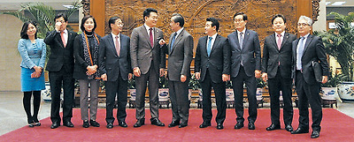 한·중 외교회담땐 쌀쌀맞던 왕이, 野의원들엔 함박웃음 - 한·중 관계를 논의하기 위해 4일 중국을 방문한 더불어민주당 의원들이 베이징 외교부 청사에서 왕이 중국 외교부장과 면담한 뒤 기념 촬영을 준비하고 있다. 왼쪽에서 둘째부터 박찬대·유은혜·유동수·송영길 의원, 왕이 부장, 박정·신동근·정재호 의원, 박선원 전 청와대 비서관. 맨 왼쪽 여성은 통역. /베이징=공동취재단