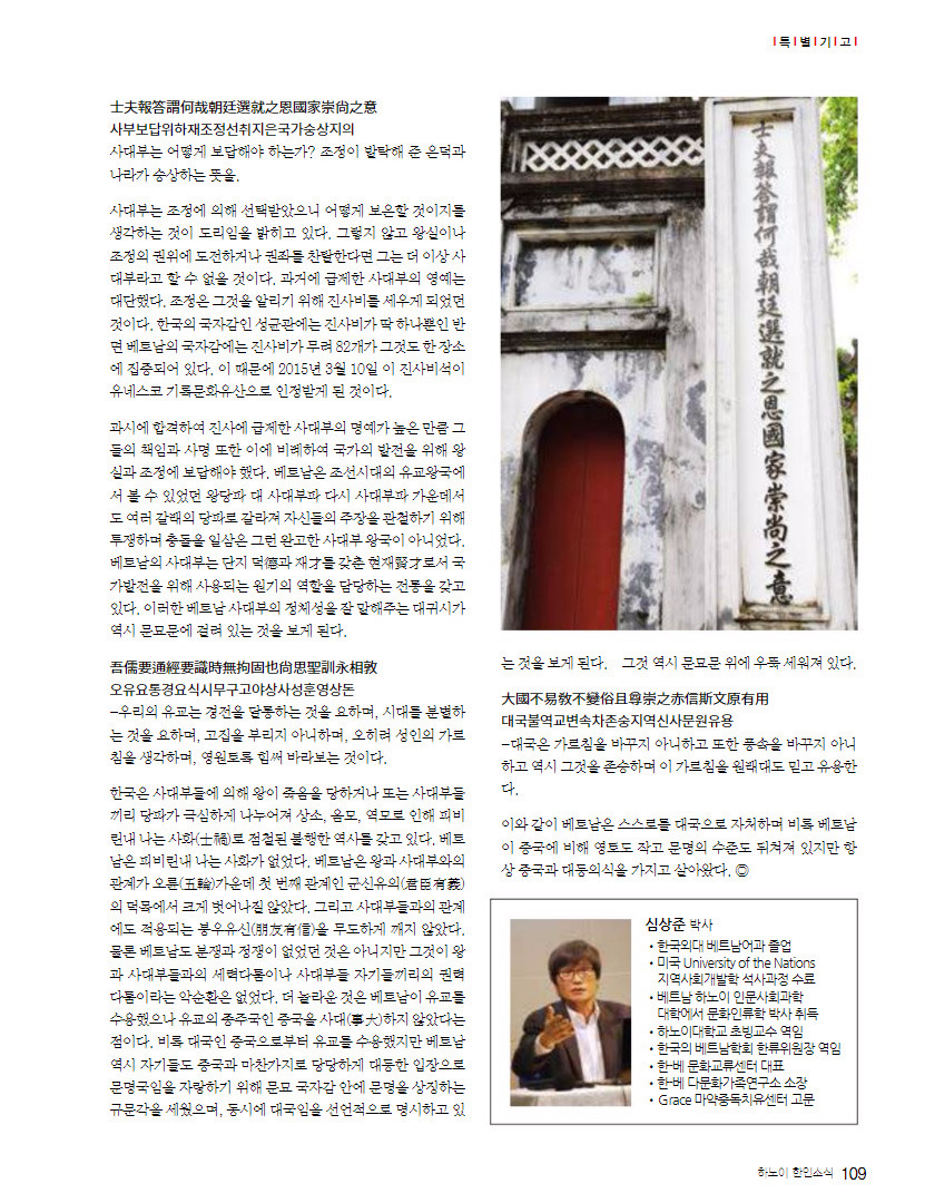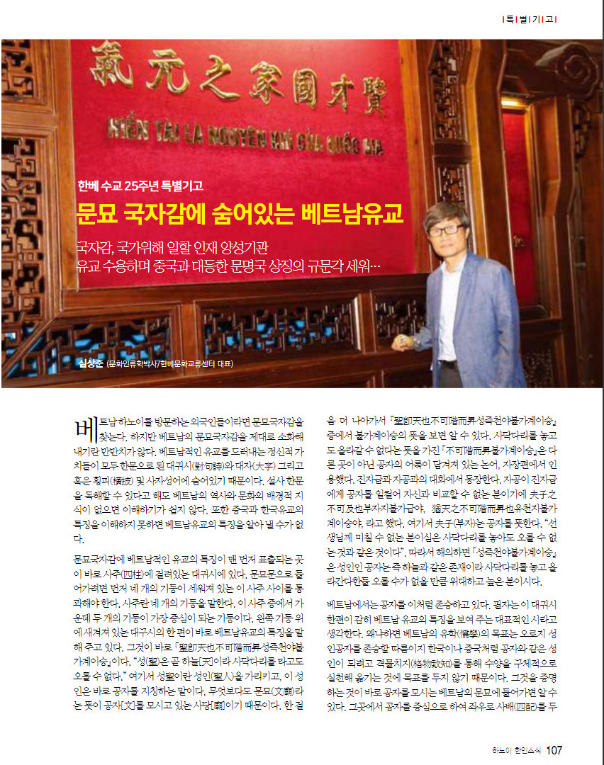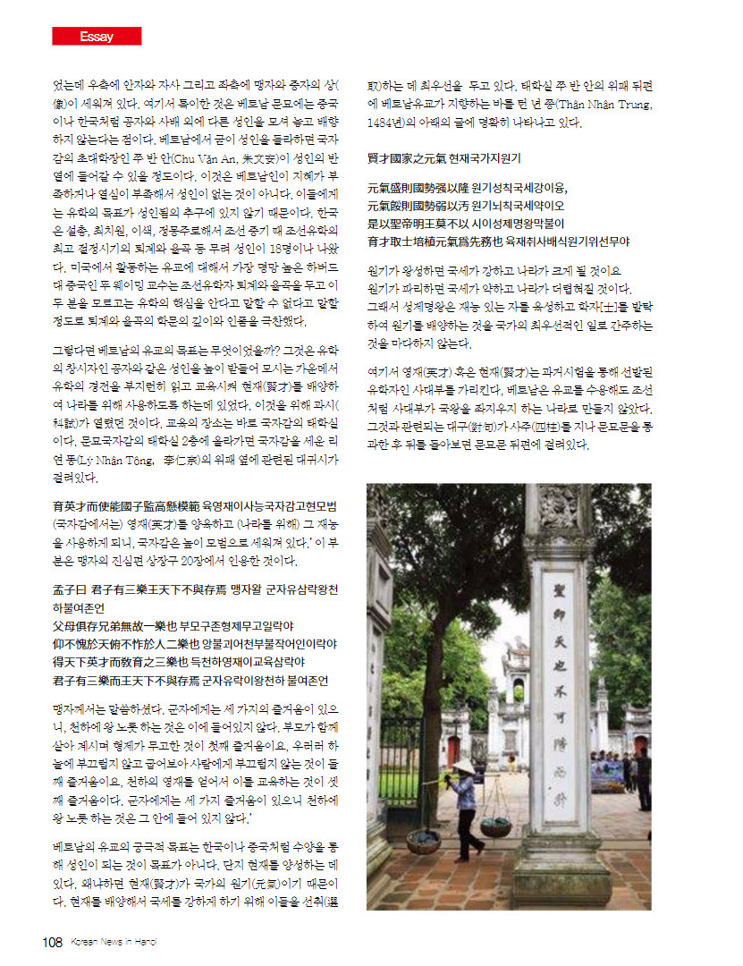 베트남 하노이를 방문하는 외국인들이라면 문묘국자감을 찾는다. 하지만 베트남의 문묘국자감을 제대로 소화해 내기란 만만치가 않다. 베트남적인 유교를 드러내는 정신적 가치들이 모두 한문으로 된 대귀시(對句詩)와 대자(大字) 그리고 혹은 횡피(橫被) 및 사자성어에 숨어있기 때문이다. 설사 한문을 독해할 수 있다고 해도 베트남의 역사와 문화의 배경적 지식이 없으면 이해하기가 쉽지 않다. 또한 중국과 한국유교의 특징을 이해하지 못하면 베트남유교의 특징을 알아 낼 수가 없다.