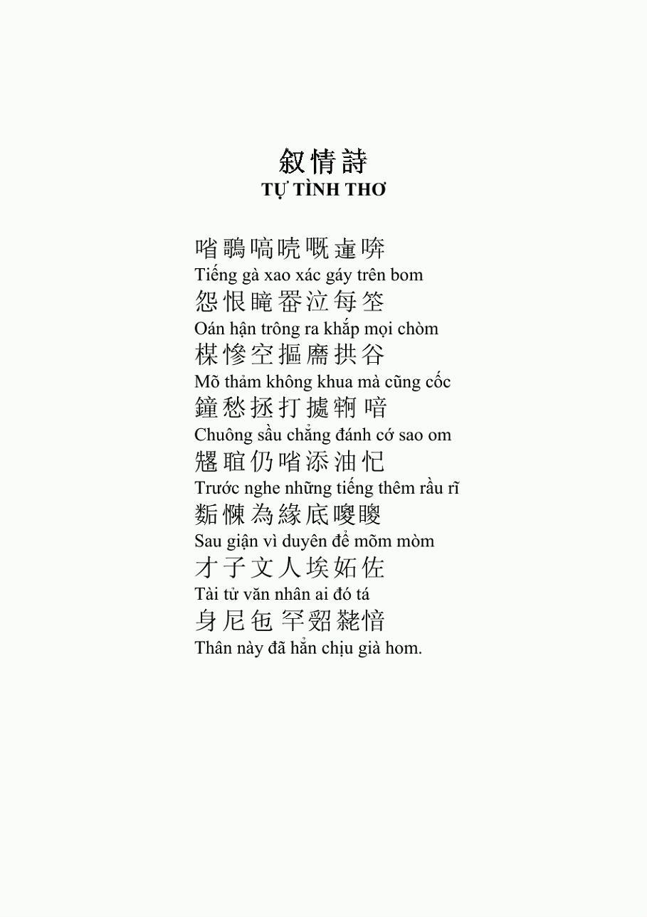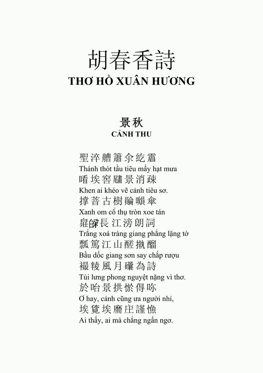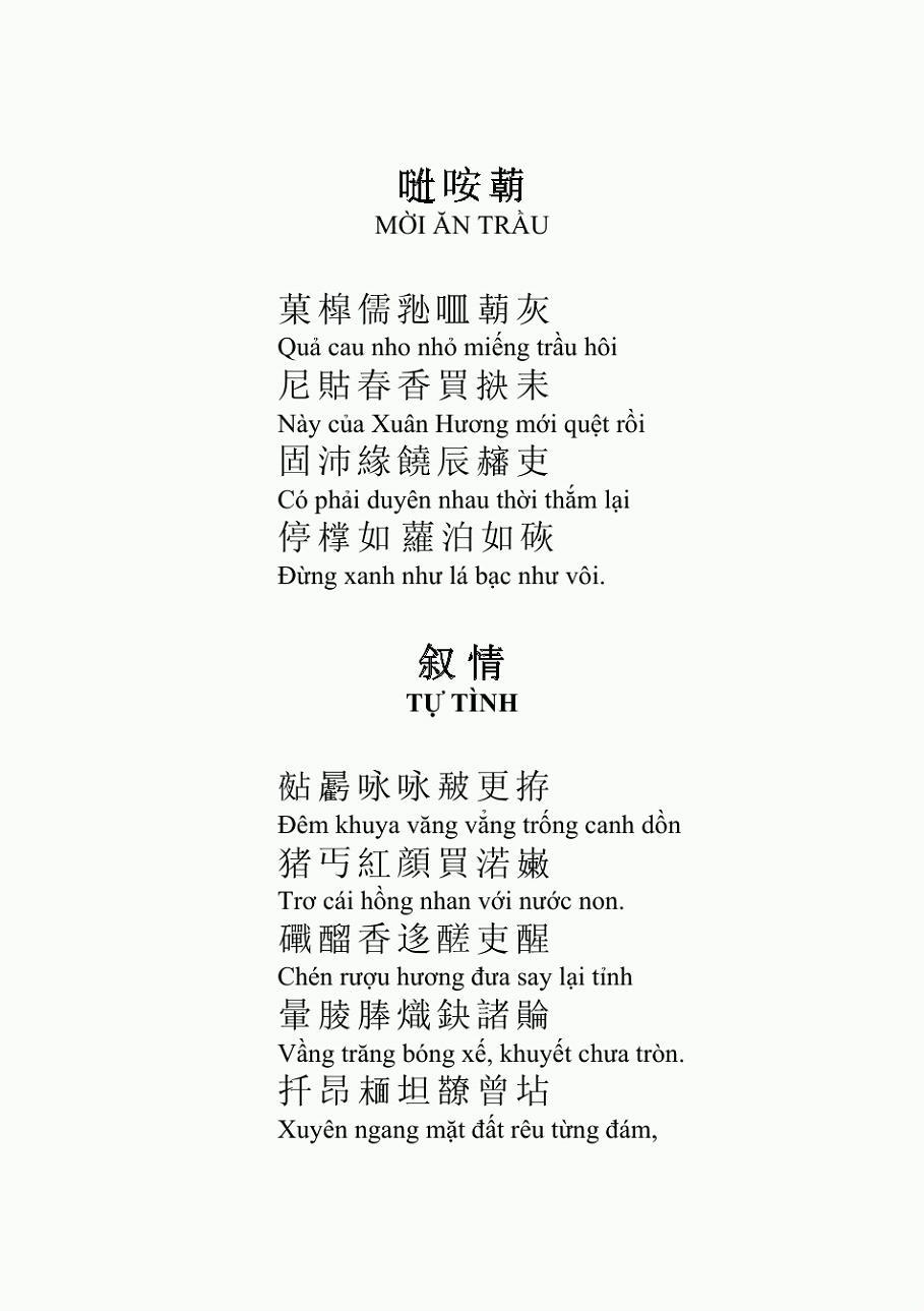 만일 이렇게 <탕원>과 <파라밀>을 읽으면, 각도와 비유가 비교적 재미있는 것을 제외하면, 시로서의 품격은 떨어진다. 그저 항간의 타유시(打油詩) 라고 할 수 있다. 그래서 나는 고민에 빠졌다. 추가로 공부를 한 후에야 비로 소 알 수 있었다. 호춘향이 시를 쓸 때는 한자를 쓰기는 했지만, 기실 그것은 중국어가 아니었고, "쯔놈(남자,喃字)”였다. 즉 한자를 빌어 만든 월남문자이다(지금은 이미 폐기되었음과 호춘향의 이들 시는 “쯔놈율시(남자율시,喃字律詩)”라는 것이다. 성취도가 아주 높다고 하며, 월남문학의 정화(精華)인 작품이다. 단지 漢語로 번역한 후에 이상해 보일 뿐이다.
