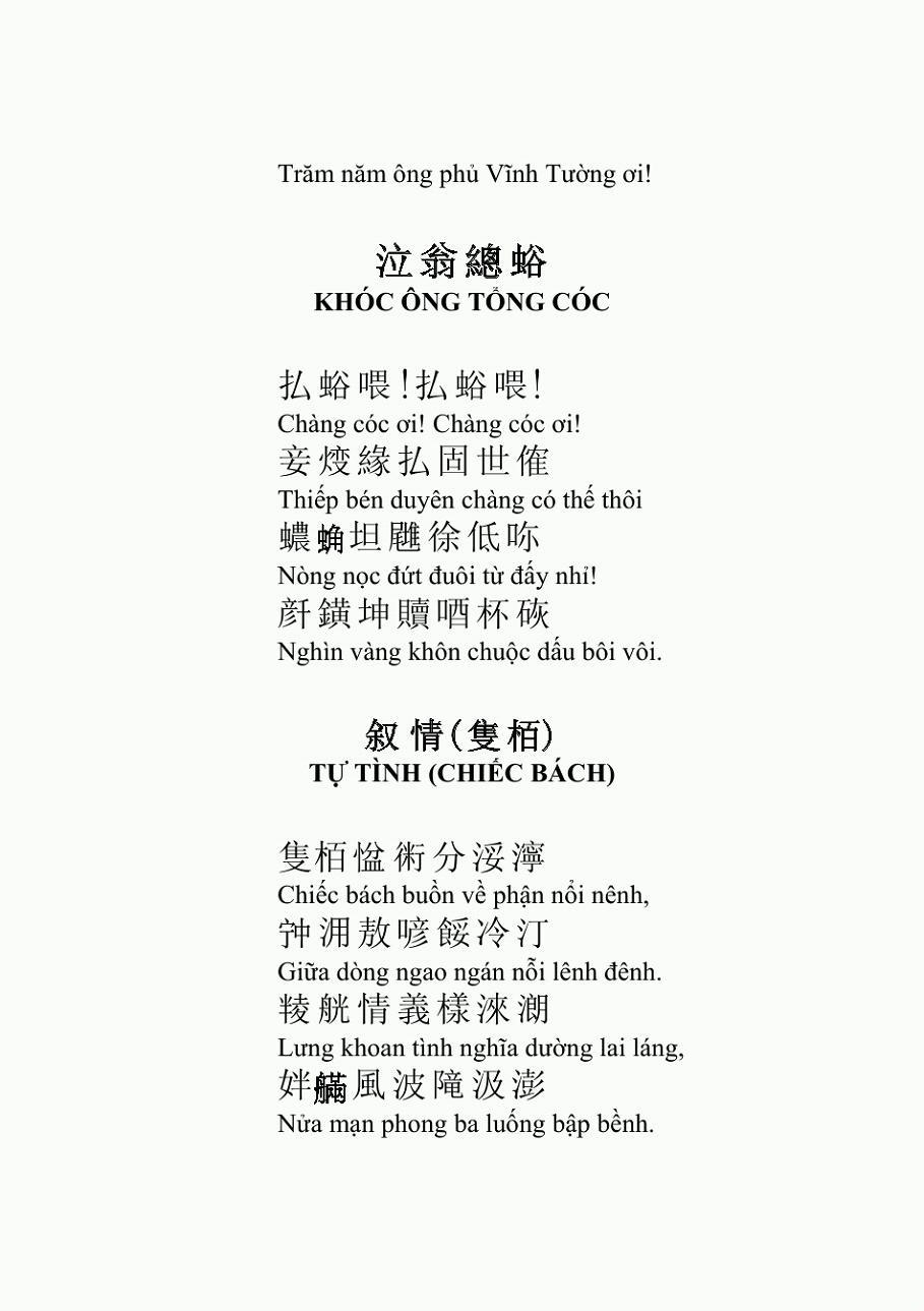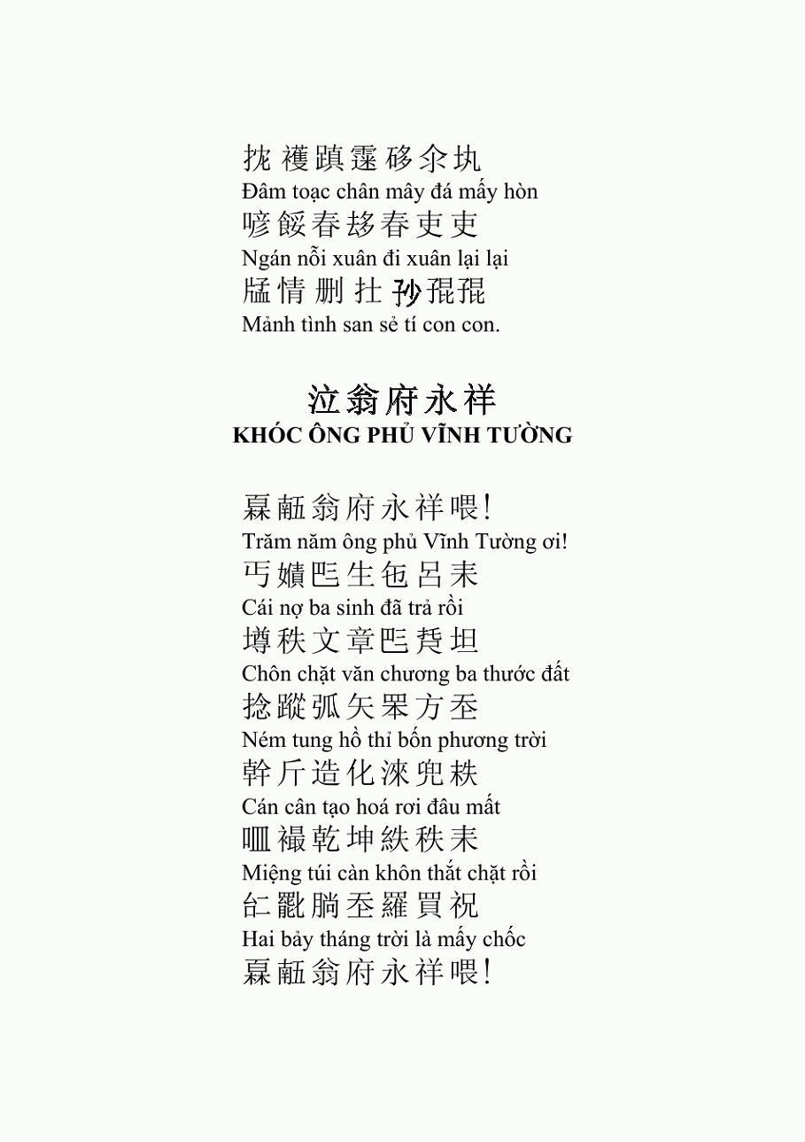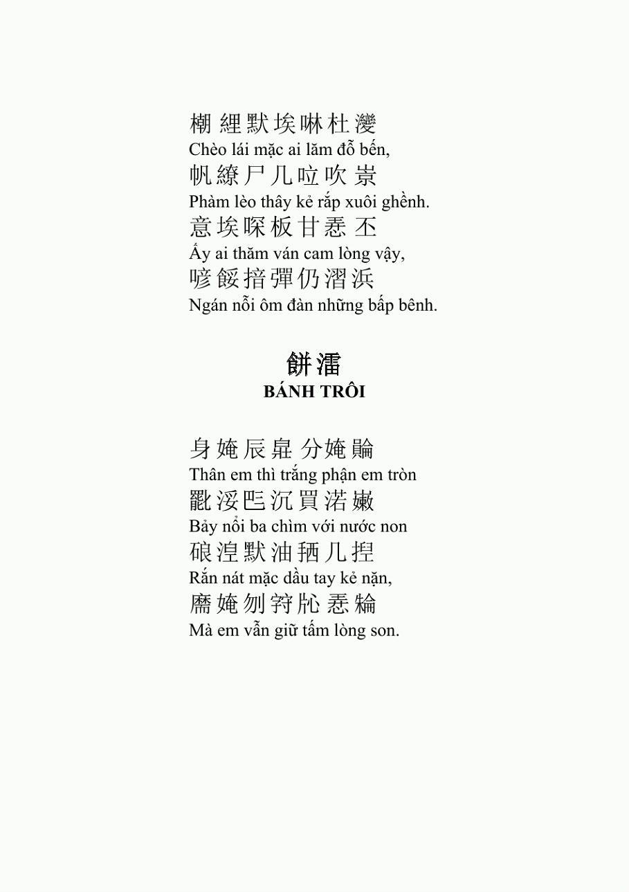 만일 이렇게 <탕원>과 <파라밀>을 읽으면, 각도와 비유가 비교적 재미있는 것을 제외하면, 시로서의 품격은 떨어진다. 그저 항간의 타유시(打油詩) 라고 할 수 있다. 그래서 나는 고민에 빠졌다. 추가로 공부를 한 후에야 비로 소 알 수 있었다. 호춘향이 시를 쓸 때는 한자를 쓰기는 했지만, 기실 그것은 중국어가 아니었고, "쯔놈(남자,喃字)”였다. 즉 한자를 빌어 만든 월남문자이다(지금은 이미 폐기되었음과 호춘향의 이들 시는 “쯔놈율시(남자율시,喃字律詩)”라는 것이다. 성취도가 아주 높다고 하며, 월남문학의 정화(精華)인 작품이다. 단지 漢語로 번역한 후에 이상해 보일 뿐이다.